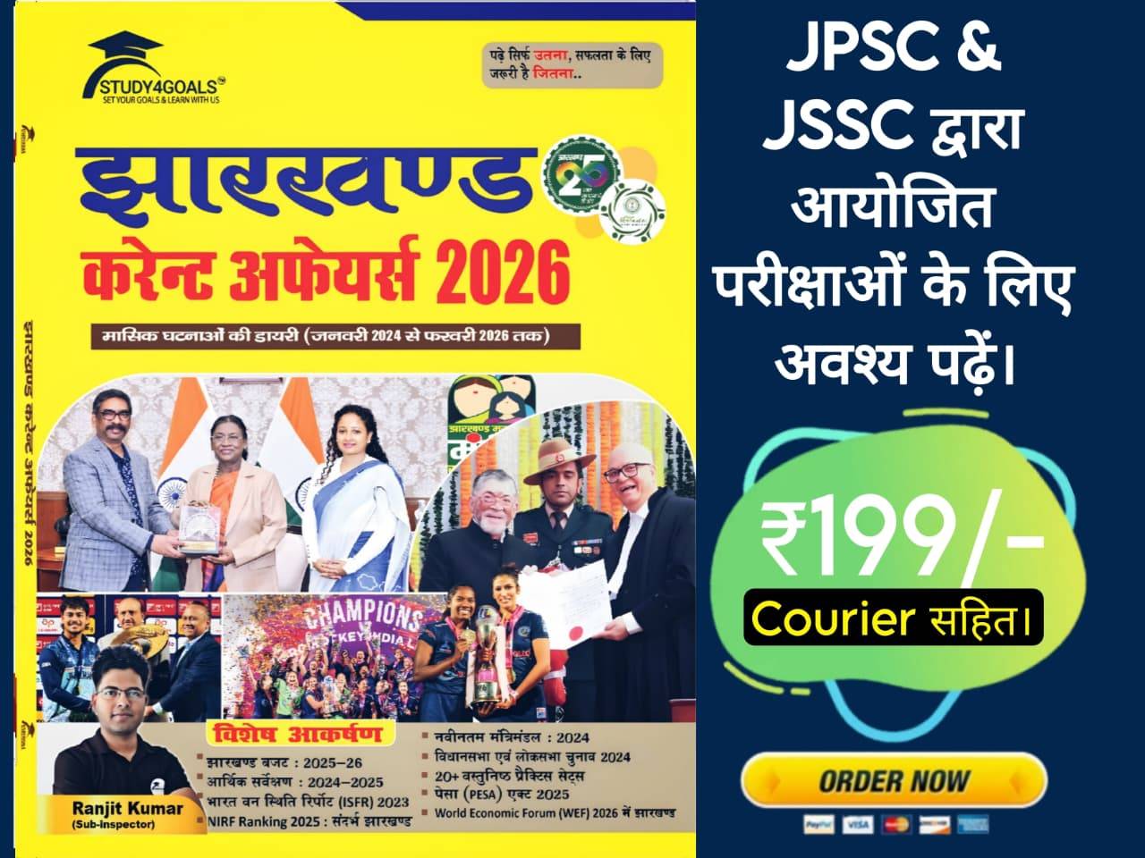 🔰 झारखंड करेंट अफेयर्स बुक ( जनवरी 2024 से फरवरी 2026 तक ) By Ranjit Sir & Team S4G 🎯🏆 🔰 यह पुस्तक झारखंड के आगामी सभी प्रतियोगी परीक्षाओं के लिए अत्यंत उपयोगी है। 🔰 इस पुस्तक में सम्मिलित कंटेंट। 1. पिछले दो वर्षों में JPSC & JSSC द्वारा पूछे गए झारखंड करंट अफेयर्स के प्रश्न। ( JPSC ACF & FRO PT 13.07.2025 के प्रश्नों सहित) 2. जनवरी 2024 से दिसंबर 2025 तक मासिक झारखंड करेंट अफेयर्स। 3. दिशाेम गुरु शिबू सोरेन निधन विशेषांक 4. Nirf Ranking 2025 : संदर्भ झारखंड 3. अबुआ बजट 2025- 26 4. आर्थिक सर्वेक्षण 2024- 25 5. भारत वन स्थिति रिपोर्ट (ISFR) - 2023 6. 38 वें राष्ट्रीय खेल - संदर्भ झारखंड 7. महिला हॉकी लीग 2025 रांची, झारखंड। 3. टॉपिक वाइज सभी सेक्शन से वस्तुनिष्ठ प्रश्नोत्तर। 4. 1500+ मोस्ट Expected One - liners 5. Important Key Points 6. 20+ मॉक टेस्ट । 7. OMR sheet & More🎯 🔰 इस पुस्तक की लिमिटेड कॉपियां प्रिंट की गई है । कृपया स्टॉक खत्म होने से पूर्व अपनी प्रति जरूर बुक करा लें। 🔰 इस पुस्तक से संबंधित अन्य जानकारी हेतु Study4goals Official No. 8986772733/7488218799 पर संपर्क करें। 🔰 झारखंड राज्य के अंदर 3 - 7 दिनों के अंदर डिलीवरी झारखंड से बाहर 5-10 दिनों में फास्ट डिलीवरी 🚚 की सुविधा के साथ उपलब्ध।* विपरीत परिस्थिति में यह समय 2-4 दिन आगे पीछे हो सकते हैं। धन्यवाद।🎯